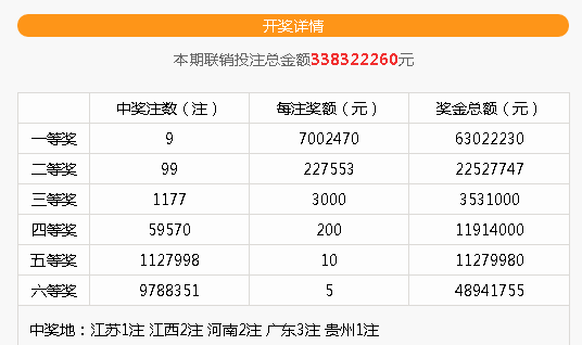 當期的9注一等獎分別被來自江蘇、江西、河南、廣東和貴州的彩友收獲。其中廣東獨攬3注成為當期頭獎最大贏家。