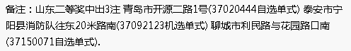 據(jù)檢索,當期山東共中出3注二等獎,分別被青島市開源二路1號37020444號投注站、泰安市寧陽縣消防隊往東20米路南37092123號投注站、聊城市利民路與花園路口南37150071號投注站的彩友收獲。