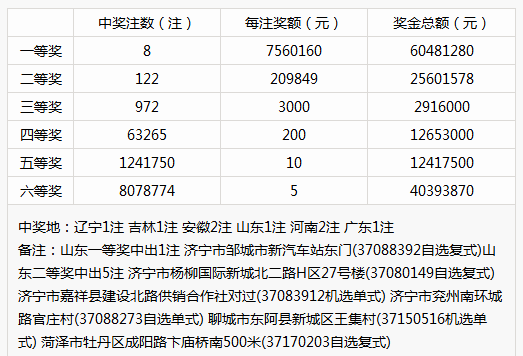 當(dāng)期大獎(jiǎng)榜上,咱們山東彩友榜上有名,濟(jì)寧鄒城市新汽車站東門37088392好投注站中得一注一等獎(jiǎng)。據(jù)檢索,這注一等獎(jiǎng)出自一張 “7+1”14元的自選復(fù)式彩票。