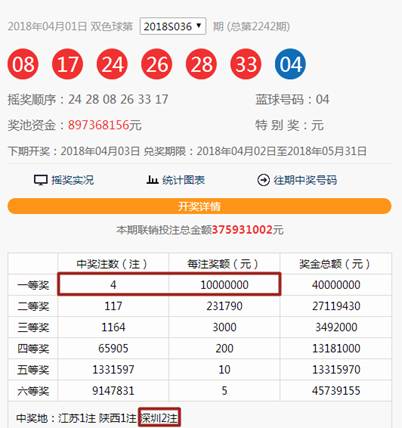 雙色球第2018036期開獎,全國爆出4注一等獎,單注獎金高達1000萬元!雙色球在僅隔兩期之后,再次爆出了1000萬的單注最高頭獎!