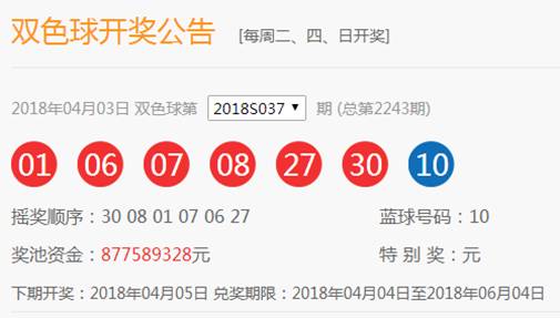 4月3日晚,雙色球第2018037期開獎,搖出紅球號碼:01、06、07、08、27、30;藍球則搖出了10。