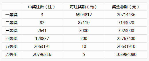 此外,除了當(dāng)期固定獎的井噴之外,一等獎也是成色十足,開出了3注690萬余元的一等獎;二等獎則是開出了82注,單注獎金8萬余元。