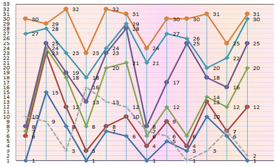 三區(23-33): 上期紅球號碼開出三枚, 屬熱號碼搭配開出。最近五期的出球個數/2/3/1/1/3,上期出號熱態出球,本期號碼注意常態出球,注意1、2路號碼,推薦號碼: 24 25 27 28 。