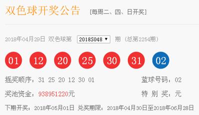 昨晚(4月29日),雙色球第2018048期開獎,搖出紅球號碼01、12、20、25、30、31;搖出藍球小號02。