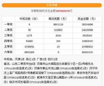 當期4注一等獎,分別花落天津、浙江、廣西和四川等四個省市。