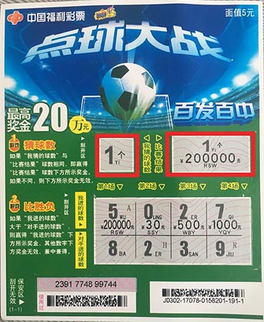 中獎當日,小杜與同事吃過午飯后,相約來到常玩彩的37038022號投注站。在投注完雙色球后,小杜移步來到刮刮樂銷售箱前,由于平時刮慣了5元票,這次小杜自然而然地把目光鎖定在5元選票區。一番觀瞧后,他在“好運123”和“點球大戰”兩款彩票上糾結起來。也在一旁選票的彩友不禁說道:“我覺得‘點球大戰’的出獎率更高一些。”小杜也是個爽快人,一聽彩友如此說,二話沒說交了20元選了4張“點球大戰”。