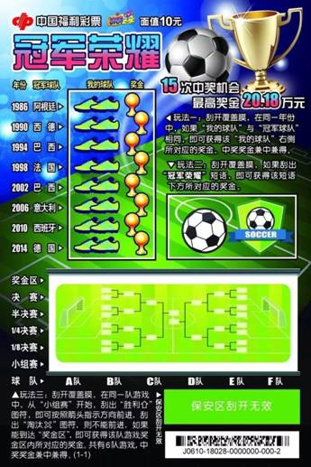 “冠軍榮耀”是一款以足球世界杯為主題的即開型福利彩票,面值10元,最高獎金20.18萬元,返獎率達65%,中獎面更是高達36.43%!彩票玩法緊扣足球世界杯,十分有趣。