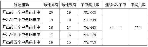 這是怎樣計算的呢?很簡單,您任二一膽全拖選了一個膽碼,第一次不中獎的幾率就是二十分之十九!感覺中獎幾率好小啊,其實不然。連續(xù)5次機會都沒有選中膽碼,其實算來就是95%×94.74%×94.44%×94.12%×93.75%=75.00%,計算到百分比小數(shù)點后兩位的話,不中獎的幾率就是75%,那么中獎幾率就是25%,也就是四分之一啦!