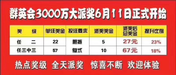 這次派獎是針對群英會游戲中的“任二”“任三中三”兩個獎級進行固定獎金派獎。派獎期間,用膽拖或復(fù)式投注方式投注“任二”“任三”,在中得“任二”“任三中三”常規(guī)獎金的同時可分別獲得5元、10元的派獎獎金。