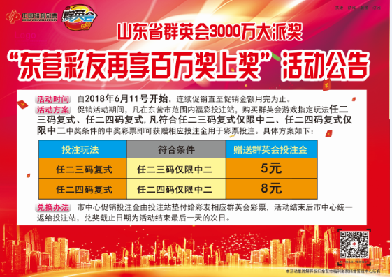 在東營市范圍內福彩投注站購買群英會游戲指定玩法任二三碼復式、任二四碼復式,中獎的彩票即可獲贈5元、8元相應的投注金用于彩票投注。