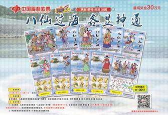 該彩票面值10元,頭獎30萬元,獎級9級,返獎率高達65%。刮開“八仙過海”的覆蓋膜,如果在同一局游戲中刮出兩個相同圖符,即可獲得該局游戲下方所對應的獎金。共有8局游戲,中獎獎金兼中兼得。如果刮出任意一個八仙的名字,即可獲得100元獎金。