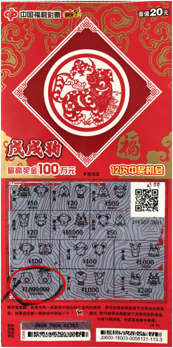 6月4日,德州一位彩友刮中戊戌狗票的一等獎,獎金100萬元。