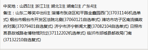 比起廣東四注一等獎歸屬讓彩友燒腦,咱們山東彩友拿下的6注二等獎就簡單多了。6注大獎分散在了淄博、煙臺、濰坊、濟寧、日照和臨沂6個地市。彩友們十八般武藝全上,機選、自選、單式、復(fù)式紛紛亮相,最終拿下了大獎。