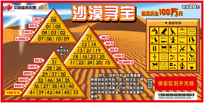 刮刮樂新品種“沙漠尋寶”設計精美,工藝細膩,本款彩票以金色沙漠為票面背景,配上藍色天空,能夠使彩民欣賞到一望無盡的沙漠奇景。提到沙漠,彩友可能想到的是神秘以及其中蘊藏的寶藏,并對尋寶充滿向往。我的號碼部分使用的埃及元素圖樣,引入了大量的古埃壁畫及象形文字符號作為裝飾,巧妙呼應“沙漠尋寶”主題,與彩票整體風格相得益彰。不失奇幻色彩的埃及風情標注區為金字塔形狀,極具歷史價值與藝術美感,使票面整體風格非常統一。此款彩票將埃及的神秘形象轉換為現代生活的趣味,讓彩友在購票的同時浸染在埃及異域文化當中,極具有收藏價值。