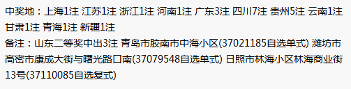 當期23注一等獎分別被上海、江蘇、浙江、河南、廣東、四川、貴州、云南、甘肅、青海和新疆的彩友拿下。