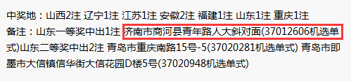 此外山東還拿下了兩注二等獎,中獎地點為青島市重慶南路15號37020281號投注站和青島市即墨市大信鎮信華街大信花園D樓5號37020948號投注站。