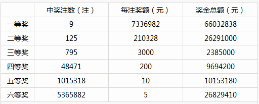當期開獎,一等獎開出9注,單注獎金高達733萬余元,二等獎當期開出了125注,單注獎金達到了21萬余元。