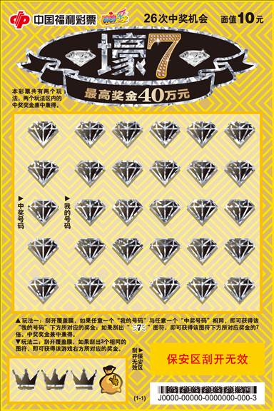 “壕7”就是豪氣。該款彩票票面采用燙金工藝,閃亮的票面與鉆石、皇冠等元素與主題呼應,非常豪氣。該款彩票主要采用了經典的對數字玩法,并在此基礎上增加7倍的即中玩法,增添了懸念與刺激性,比對次數達到5對25。玩法二為三同圖玩法,簡單易懂。值得一天的是,該款彩票每本可中得一個100元或者70元。