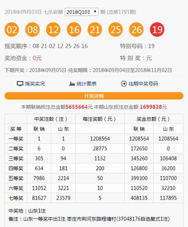 9月3日,七樂彩第2018103期開獎,全國爆出一注一等獎,單注獎金1208564元。這注全國唯一一注的七樂彩頭獎,再次花落山東!