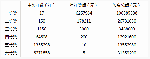 17注一等獎分別被北京、上海、江蘇、安徽和河南的彩友拿下。其中,河南單期獨攬10注一等獎。若為一人所中,則該彩友或獨攬6257萬大獎。