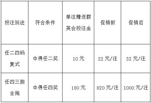 自9月12日起,連續(xù)促銷直至100萬獎金用完為止。在東營市內(nèi)范圍內(nèi)福彩投注站,購買群英會游戲指定玩法“任二四碼復式”和“任四三膽全拖”并分別中得任二獎、任四獎的,即可獲贈相應投注金用于彩票投注。具體方案如下: