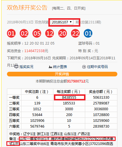 9月13日晚,雙色球第2018107期開獎,紅球01、02、05、12、20、22,藍(lán)球01,全國開出6注一等獎,每注獎金8438555元,分別被遼寧、浙江、江西、廣西和山東幸運彩友收獲,當(dāng)期山東的一等獎再次被濰坊彩友獨攬,大獎出自濰坊市諸城明誠市場北的37078233號投注站,數(shù)據(jù)檢索,中獎方式依然是自選單式,依舊是一張8元4注的自選單式票。