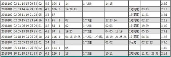 上期的開獎號碼:紅球10、11、18、23、31、33,藍球15,和值126,三區比2:1:3,極矩為23,大小比4:2,奇偶4:2,同尾號兩枚,兩連號一組。