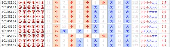 大小比分析:上期大小比4:2,上期號碼大數開出多,注意大小數號碼均衡,本期適當關注3:3或2:4比。