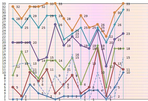 三區(23-33): 上期紅球號碼開出三枚,屬溫號碼搭配開出。最近五期的出球個數/2/1/0/2/3,上期號碼熱態開出,注意號碼仍有余熱,本期注意后段號碼,關注0、2路號碼,推薦號碼:23 27 29 32。