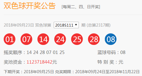 9月23日晚雙色球第111期開獎,當(dāng)期紅球開出01、07、14、24、25、28;藍(lán)球開出出偶數(shù)08。