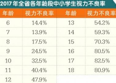 據統(tǒng)計,2017年我省6歲至18歲中小學生視力不良總檢出率為37.6%,比2016年的38.1%下降了近1個百分點,據悉,這已是我省中小學生視力不良總檢出率連續(xù)第3年下降。所謂視力不良是指雙眼裸眼中心遠視力低于5.0,包括近視、遠視和弱視。從各年齡段視力不良率看,隨著年齡增長視力不良檢出率迅速升高,以2017年數據為例,全省6歲學生視力不良率為14.4%,13歲學生就達到了54.2%,十七八歲時達到80%以上。