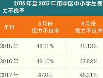 與全國相比,我省中小學生視力不良檢出率在各年齡段均好于全國平均水平,但隨年齡增加差距減小。同時,我省中小學視力問題又呈現性別和地域特點,比如,2017年我省女生視力不良檢出率比男生高7.5個百分點,城鎮(zhèn)學生視力不良檢出率比農村學生高13.3個百分點。