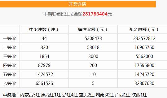10月4日,福彩雙色球第2018116期開獎(jiǎng),當(dāng)期全國井噴44注一等獎(jiǎng),單注獎(jiǎng)金530萬余元;另外還井噴320注二等獎(jiǎng),單注獎(jiǎng)金5萬余元!