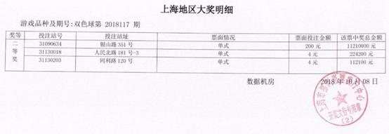 據上海福彩網消息,當期雙色球開獎,上海彩友攬獲103注二等獎,其中100注一等獎出自上海市銀山路351號投注站。