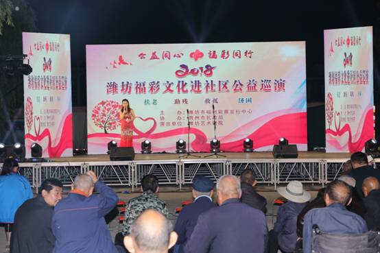 9月25日晚,由濰坊市福彩中心主辦,青州市民政局協辦,濰坊藝術劇院部分演職人員參與演出的“公益同心福彩同行”——2018年“濰坊福彩文化進社區”公益巡演活動來到青州市中心敬老院,給老人們送來了精彩的歌舞表演,為700余位老人獻上一份快樂、喜慶的節日大禮。