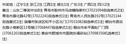 山東彩友當(dāng)期拿下了8注二等獎(jiǎng),可謂是收獲頗豐。中獎(jiǎng)地市分別是青島、淄博、煙臺(tái)和泰安。彩友們也是用盡各種投注方式:自選、機(jī)選、單式、復(fù)式。