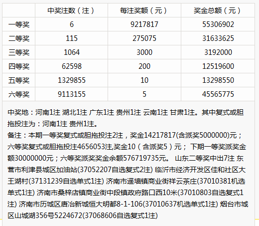 6注一等獎(jiǎng)分別被河南、湖北、廣東、貴州、云南和甘肅6個(gè)省份的彩友攬獲,其中河南和貴州彩友由于是復(fù)式或膽拖投注,將獲得高達(dá)1421萬(wàn)余元的獎(jiǎng)金。