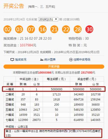 據檢索,當期一等獎的中獎站點為濰坊市市政府招待所西門對面37078405號投注站,中獎彩票是一張10元5注的機選單式彩票!彩友用10元錢拿下了500萬的驚喜獎金!