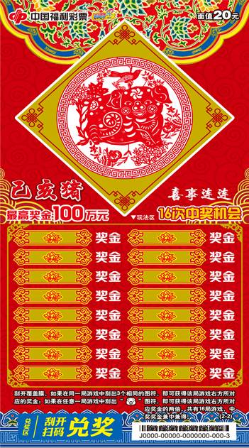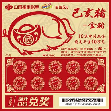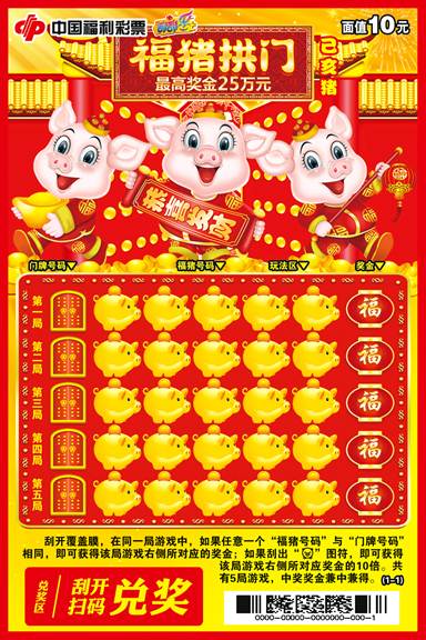 “己亥豬-福豬拱門”是為慶祝己亥豬年而推出的一款生肖紀念票。該款彩票取材于中國傳統生肖文化,畫面中形體飽滿、憨厚可愛的三只福豬造型生動、熱鬧喜慶。彩票再以玩法區進行總體布局,烘托出紅火、歡快的節日氛圍,寓意福豬送福運。彩票采用“數字比對+特殊圖符”玩法,簡單好玩。