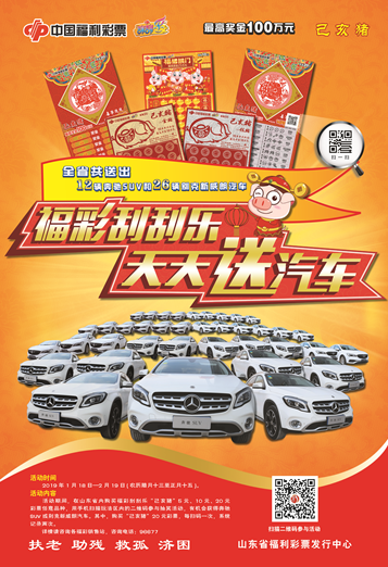 為迎接己亥豬年的到來,福彩刮刮樂特推出豬年專題賀歲票,分5元、10元、20元三個面值,形成套票。為回饋彩票購買者,山東省福彩中心將于2019年1月18日—2月19日(農歷臘月十三至正月十五)在全省開展“福彩刮刮樂,天天送汽車”活動。活動期間,在山東省內購買福彩刮刮樂“己亥豬”5元、10元、20元彩票任意品種,用手機掃描玩法區內的二維碼參與抽獎活動,有機會獲得奔馳SUV或別克新威朗汽車。其中,購買“己亥豬”20元彩票,每掃碼一次,系統記錄兩次。2月14日當天參與掃碼的女性彩票購買者,除可獲得常規抽獎機會外,還將額外獲得一次抽取奔馳SUV的機會。