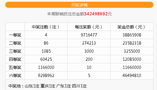 1月17日,福彩雙色球第2019008期開獎,全國共開出了4注一等獎,單注獎金971萬余元;還開出86注二等獎,單注獎金高達27萬余元。