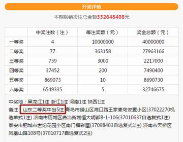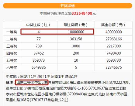 當期開獎,山東彩友也攬獲了5注二等獎!據檢索,5注二等獎的幸運誕生地分別為青島、濟南、泰安。