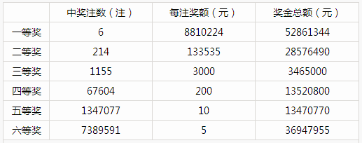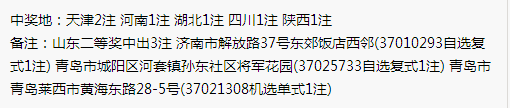 當期的6注一等獎分別被天津、河南、湖北、四川和陜西5個省市的彩友拿下。其中,天津獨攬2注一等獎。