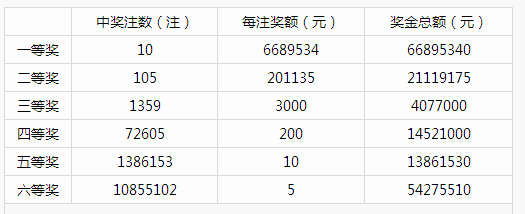 雙色球第026期開獎,一等獎井噴10注,單注獎金668萬余元;二等獎開出105注,單注獎金高達20萬余元;固定獎開出12315219注。