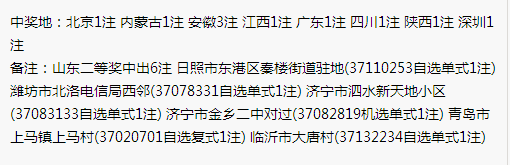 山東彩友當期拿下6注二等獎,中獎站點分別是日照市東港區秦樓街道駐地37110253號投注站,濰坊市北洛電信局西鄰37078331號投注站,濟寧市泗水新天地小區37083133投注站,濟寧市金鄉二中對過37082819號投注站,青島市上馬鎮上馬村37020701號投注站和臨沂市大唐村37132234號投注站。