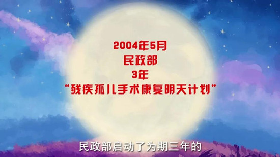 2004年5月,民政部啟動了為期三年的“殘疾孤兒手術康復明天計劃”,專門幫助各類社會福利機構中0至18歲殘疾孤兒解除疾患,讓他們融入社會,回歸家庭。